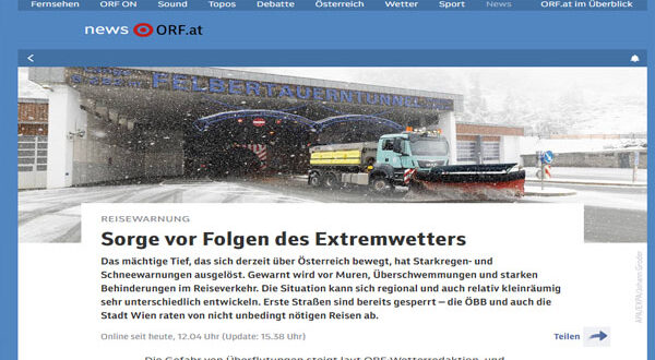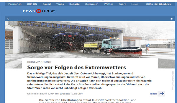 تتعرض النمسا لمنخفض جوي قوي تسبب في تغير الطقس بشكل مفاجئ من ارتفاع قياسي في درجات الحرارة إلى هطول أمطار غزيرة، ورياح قوية، وعواصف رعدية، وانخفاض كبير في درجات الحرارة وتساقط الثلوج بكثافة في ولايات تيرول وسالزبورغ وشتاير مارك.