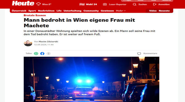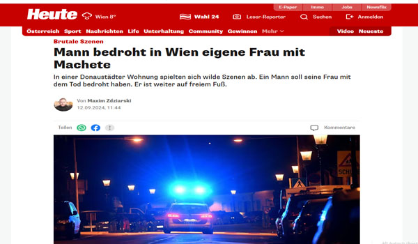 ألقت شرطة العاصمة النمساوية فيينا على الفور القبض على شخص بولندى بالحى الثانى يبلغ من العمر 59 عامًا عندما أقدم على تهديد زوجته التى تبلغ من العمر 47 عام باستخدام ساطور خلال شجار وقع بينهما مساء يوم الثلاثاء الماضى
