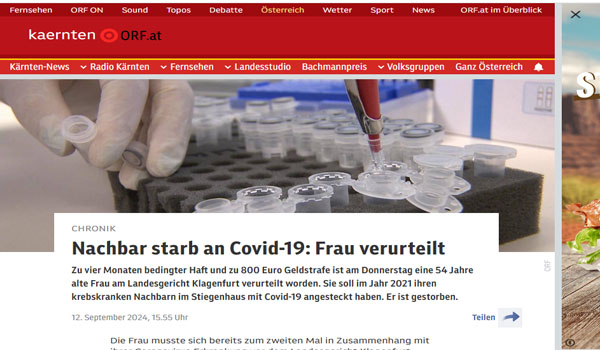أُدينت امرأة نمساوية بإصابة جارها بفيروس «كورونا» ما تسبب بوفاته، بعد أن تجاهلت قواعد الحجر الصحي وفشلت في ارتداء القناع الواقي.