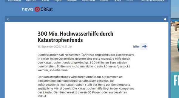 وقال المستشار النمساوي – في تصريحات اليوم الإثنين – إنه في ضوء وقوع الفيضانات في أجزاء كثيرة من النمسا تم تخصيص مساعدة مالية أولية من صندوق الكوارث بقيمة 300 مليون يورو وإذا لم تكن كافية فيمكن زيادتها.