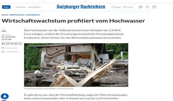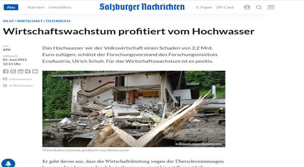 واستند الخبير الاقتصادي فيلبر ماير إلى نتائج دراسة أجراها معهد البحوث الاقتصادية، تناولت العواقب الاقتصادية الشاملة للفيضان المدمر، الذي ضرب النمسا في عام 2002، حيث قدر الاقتصاديون حجم خسارة القيمة المضافة الناجمة عن فقدان الإنتاج بنسبة 0.1% من الناتج المحلي الإجمالي بقيمة 180 مليون يورو.