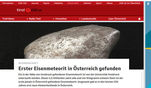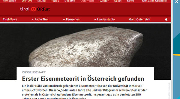 وأعلنت جامعة “إنسبروك” عن اكتشاف النيزك الحديدي الاستثنائي، وأكدت الفحوصات أنه أول نيزك حديدي يتم العثور عليه في النمسا بشكل مثبت علميًا، وفقًا لتأكيد يورغن كونتسيت الخبير في معهد علم المعادن والصخور بالجامعة.