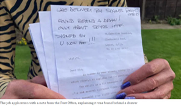 تمكنت امرأة تبلغ من العمر 70 عاماً من لينكولنشاير (المملكة المتحدة)، أخيراً من حل لغز سبب عدم تلقيها الرد بشأن رغبتها في الحصول على وظيفة أحلامها كمتسابقة دراجات نارية في عام 1976، وذلك بعدما تلقت تيزي هودسون، وهي سيدة محبة للمغامرات، خطاب طلب الوظيفة الأصلي الخاص بها، بعد 48 عاماً من وضعه خلف درج مكتب البريد.