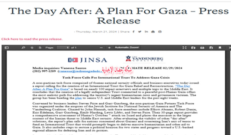 من بين هذه الخطط، خطة أعدها فريق من المعهد اليهودي للأمن القومي الأمريكي (JINSA) وتحالف “فاندنبرغ”، وأطلق الفريق على نفسه اسم “فرقة عمل مستقبل غزة”. وضم الفريق بعض المستشارين الأمريكيين السابقين للأمن القومي والمؤيدين بشدة لإسرائيل.