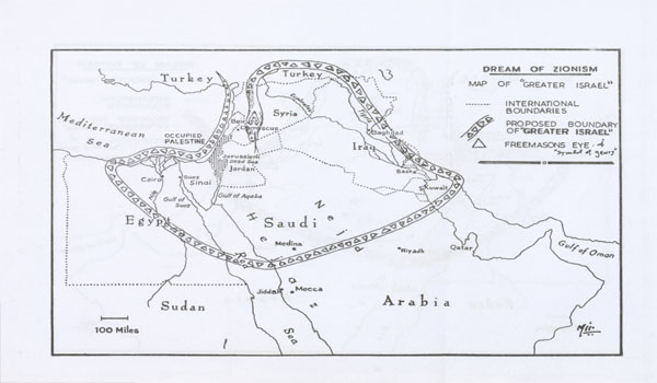 الخريطة التي سميت “حلم صهيون”، تظهر الصهيونية على شكل ثعبان عملاق، وظهره مزين بنمط من المثلثات الموصوفة بأنها “عين الماسونيين، رمز اليهودية”، ويحدد ” الحدود المقترحة لإسرائيل الكبرى”.