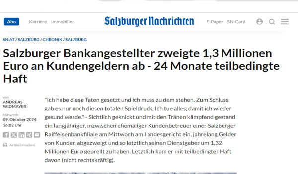 إدانة محكمة فرعية بمدينة سالزبورج النمساوية موظف في أحد البنوك بالمدينة بالسجن 24 شهرًا أستولى على أكثر من 1.3 مليون يورو بغير جق من حسابات العملاء حسبما نشرت الصحف النمساوية اليوم ، منهم ثمانية أشهر إلزامية، بعد إدانته بتهمتي خيانة الأمانة والاختلاس.