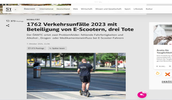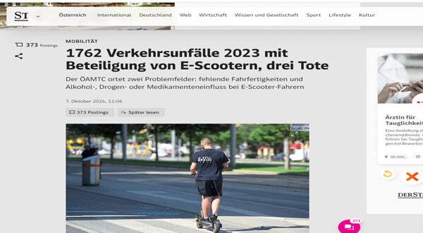 في التقرير السنوي عن حوادث السكوتر الكهربائي بالنمسا والمخالفات الإدارية في عام 2023، تشير الصحف النمساوية إلى وقوع 1762 حادثًا يتعلق بهذا النوع من المركبات “السكوتر” بسبب نقص المهارات والقيادة تحت تأثير الكحول وراء العديد من هذه الإصابات