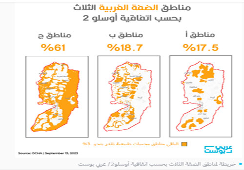 واليوم يُقتصر معظم الفلسطينيين في الضفة الغربية على المنطقتين (أ) و(ب)، اللتين تحكمهما جزئيًا السلطة الفلسطينية، ومؤخراً حاول رئيس الوزراء الإسرائيلي بنيامين نتنياهو تحويل الضم الفعلي لأجزاء من الضفة الغربية ليصبح ضمًا رسميًا.