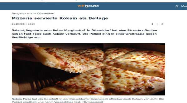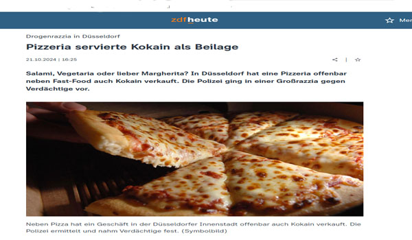 دهمت الشرطة الألمانية مطعم بيتزا في مدينة دوسلدورف -غرب البلاد-، بعد تلقيها تقارير تفيد بأن وجبة مشهورة يقدمها المطعم كانت تتضمن مخدر الكوكايين.