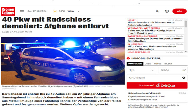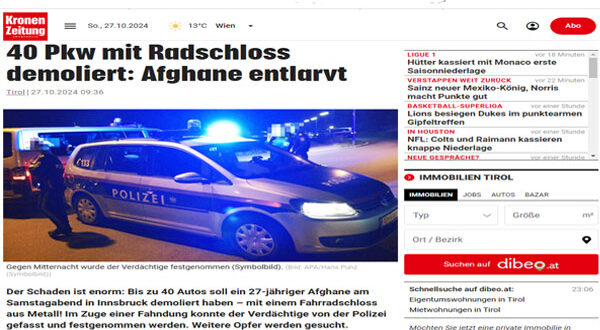 شرطة مدينة إنسبروك تلقي القبض على شاب أفغانى ، يبلغ من العمر 27 عامًا ، قام بتحطيم متعمد لزجاج 30 إلى 40 سيارة مركونة في شوارع المدينة ، باستخدام قفل دراجة ، مساء يوم أمس السبت ، فى مدينة إنسبروك النمساوية والتي تقع في أقصى غرب البلاد ،