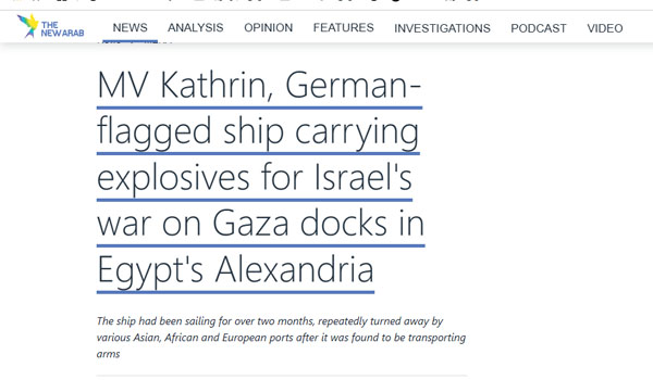 وذكروا في بيان على وسائل التواصل أنهم قدموا “بلاغا عاجلا إلى النائب العام ضد كل من رئيس مجلس الوزراء بصفته، ورئيس هيئة ميناء الإسكندرية بصفته، والمديرة التنفيذية لشركة (EMCO)، المكتب المصري للاستشارات البحرية (إیمكو)، بشأن السفينة الألمانية (كاثرين)، والتي تحمل حاويات تحتوي على مواد متفجرة متوجهة إلى جيش الاحتلال الإسرائيلي”.