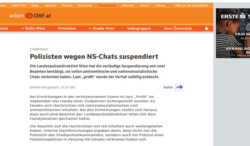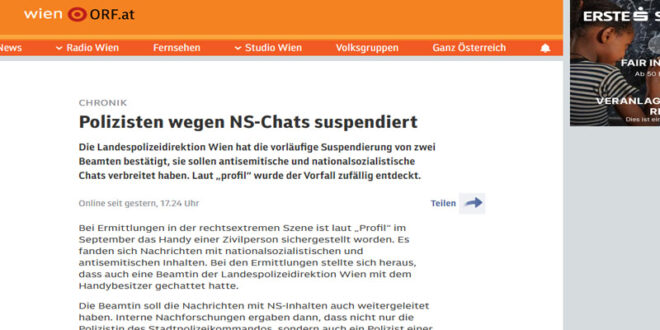 ذكرت الصجف النمساوية الصادرة اليوم عن إيقاف رجل وأمراة تابعين لشرطة فيينا عن العمل مؤقتاً، وهما ، بعد اكتشاف تورطهما في نشر محتوى على الإنترنت ذات طابع نازي ومعادٍ للسامية.