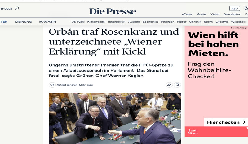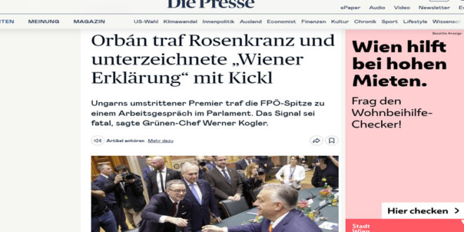 أثار توقبع “إعلان فيينا” بين رئيس الوزراء المجرى فيكتور أوربان وزعيم حزب الحرية النمساوي اليمين هربرت كيكل “النمسا” في فيينا يوم أمس الخميس ضجة واسعة، إذ تم انتقاد توقيع كيكل باسم النمسا واعتبر ذلك بمثابة “انتحال للصفة السياسية”.