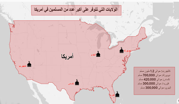 ويتركز وجود المسلمين في أمريكا بعدد أكبر في كل من ولاية كاليفورنيا، ونيويورك، وفيرجينيا، وميريلاند، وإلينوي، بالإضافة إلى ثلاث ولايات تعتبر من الولايات المتأرجحة القادرة القادرة على حسم السباق وهي ولاية ميشيغان، وجورجيا، وبنسلفانيا.