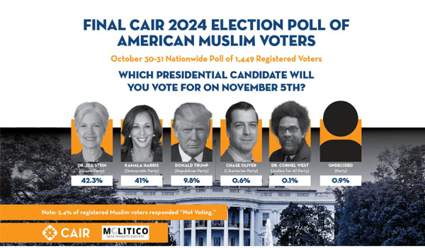 في نفس سياق توجه أصوات المسلمين في الانتخابات الأمريكية 2024 أظهر استطلاع رأي لمجلس العلاقات الأمريكية الإسلامية (كير) أن 41% من الناخبين المسلمين في الولايات المتحدة يفضلون مرشحة الحزب الأخضر جيل شتاين كمرشحة رئاسية في عام 2024.