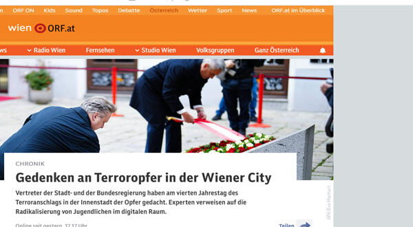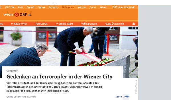 أحيت فيينا ذكرى ضحايا هجوم إرهابي، بعد مرور أربع سنوات على مقتل أربعة أشخاص برصاص شخص متعاطف مع تنظيم «داعش»، في وسط العاصمة النمساوية. وقال عمدة فيينا، مايكل لودفيج، في مراسم إحياء الذكرى السنوية الأولى: لابد من تجاوز الكراهية عبر التضامن ، وأن هذه المدينة قوية بسكانها.