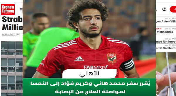 كشف الإعلامى محمد الليثى قرار النادي  الأهلي سفر ثنائي الفريق محمد هاني وكريم فؤاد إلى النمسا خلال الأيام القليلة المقبلة من أجل الخضوع إلى فحوصات ومتابعة لدى أحد الأطباء المُتخصصين هناك من أجل معرفة مدى استجابتهما للبرنامج التأهيلي الذي يخضعان له منذ فترة للتعافي من الإصابة التي يعاني منها كل منهما.
