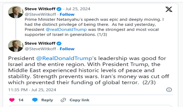 4- ستيف ويتكوف (مبعوث الشرق الأوسط): “قيادة ترامب كانت جيدة لإسرائيل وللمنطقة”