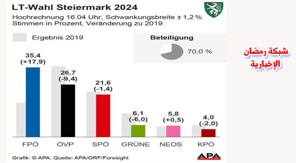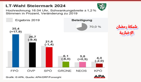 تشير التقديرات الأولية إلى فوز حزب الحرية النمساوي اليميني المتطرف والذي أسسه نازيون سابقون بالانتخابات البرلمانية في مقاطعة إشتاير مارك لأول مرة في تاريخه بنسبة 35.4، فيما حل حزب الشعب المحافظ في المركز الثاني و26,7 حزب الاشتراكيون الديمقراطى بنسبة 21,6.
