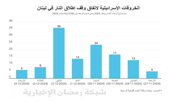 • منذ صباح الأربعاء 27 نوفمبر وحتى صباح الأربعاء 4 ديسمبر بلغ مجموع الخروقات الإسرائيلية لاتفاق وقف إطلاق النار 123 خرقاً وفق إحصائيات وكالة الأنباء اللبنانية الرسمية اليومية.