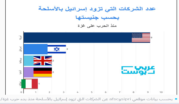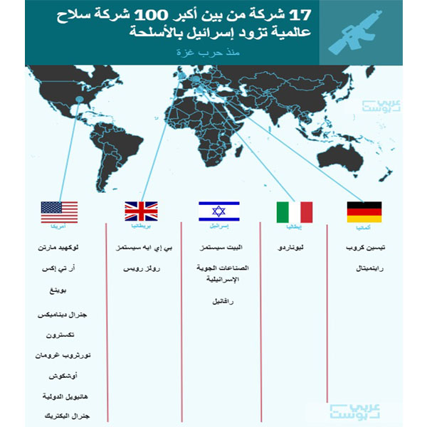 أظهرت تقارير وبيانات من مصادر مفتوحة أن 17 شركة عالمية في قائمة أكبر 100 شركة في صناعة الأسلحة في العالم تزود الجيش الإسرائيلي بالأسلحة والذخائر والمعدات منذ أن بدأت الحرب على غزة في السابع من أكتوبر/تشرين الأول 2023.