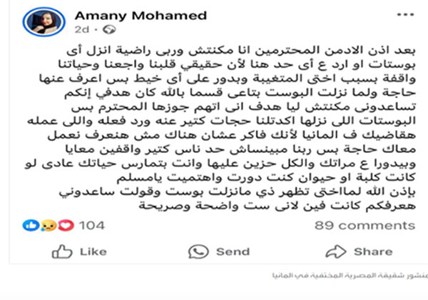 وخرجت شقيقة المصرية المختفية “إيمان محمد حسن” 35 عاما، عن صمتها ولجأت لصفحات المصريين المغتربين في ألمانيا للسؤال عن شقيقتها، وأفادت أن آخر اتصال للأسرة معها كان قبل نحو شهر، ومنذ ذلك الحين ويتعذر التواصل معها، كما أن صفحاتها على مواقع التواصل لم تعد تعمل.