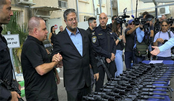 وزير الأمن القومي الإسرائيلي إيتمار بن غفير يوزع رشاشات أمريكية على المستوطنين يوم 27 أكتوبر 2023