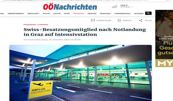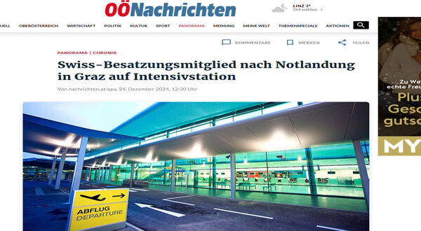 وأوضحت “سويس”، المملوكة لشركة لوفتهانزا، إن الطائرة هبطت في مدينة جراتس النمساوية ونُقل أحد أفراد طاقم الطائرة إلى المستشفى بمروحية.