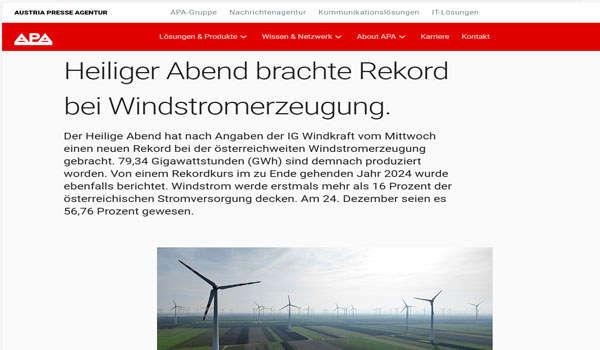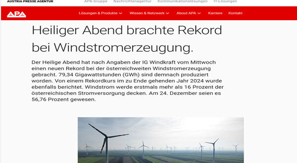 ذكرت شركة “ويند كرافت” النمساوية لطاقة الرياح أن ليلة عيد الميلاد حققت رقما قياسيا جديدا لتوليد طاقة الرياح في جميع أنحاء النمسا; حيث تم إنتاج 79.34 جيجاوات/ساعة