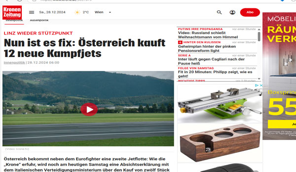 وذكرت الصحيفة النمساوية نقلا عن مصادر عسكرية إن خطاب نوايا من المقرر أن يوقع اليوم السبت مع وزارة الدفاع الإيطالية بشأن شراء الطائرات التي تصنعها شركة ليوناردو الإيطالية.