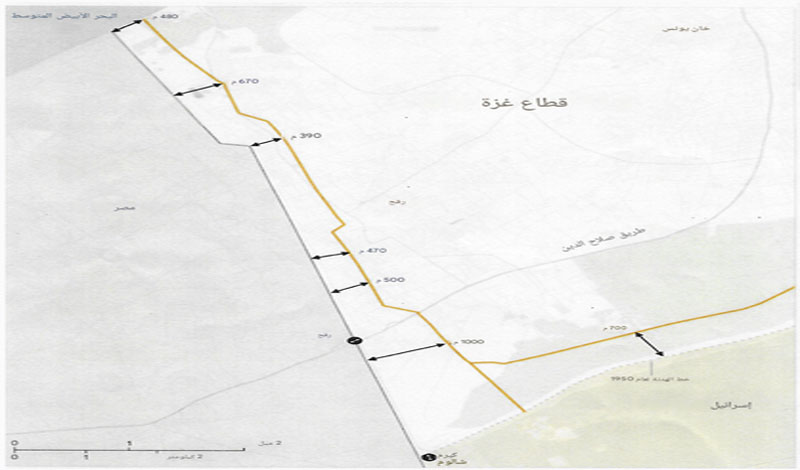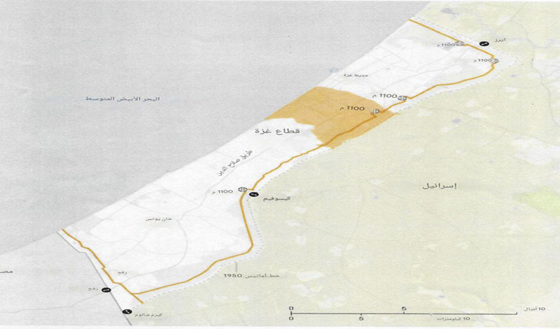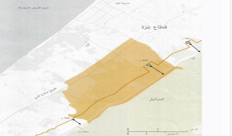 كما تقرر بالاتفاق قيام قوات الاحتلال بإعادة الانتشار في محيط 700 متر، باستثناء خمس نقاط محددة لا تزيد عن 400 متر إضافية، على طول حدود قطاع غزة، وفقاً للخريطة المرفقة.