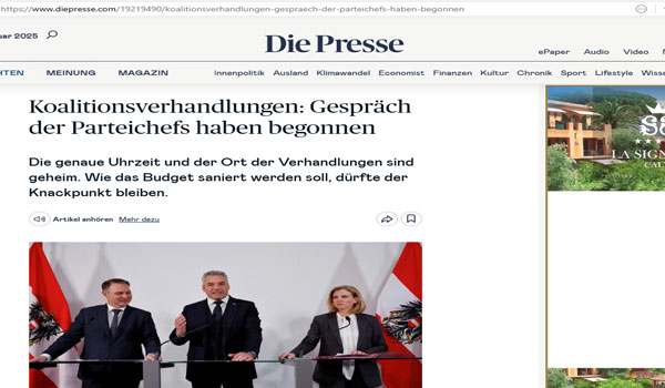 بدأت مساء اليوم الخميس الموافق 2 من يناير 2025 جولة جديدة من المفاوضات بين الأحزاب الثلاثة المرشحة لتشكيل الائتلاف الحكومى فى النمسا.