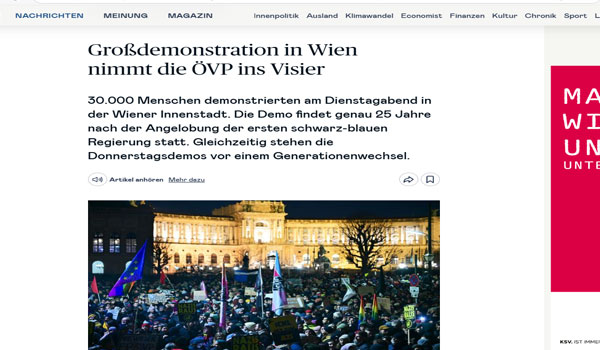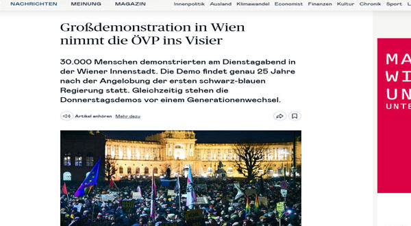 شارك 30 ألف شخص في مظاهرة حاشدة بوسط العاصمة النمساوية فيينا للتنديد بتشكيل حكومة جديدة بقيادة حزب الحرية الذي ينتمي الى تيار اليمين المتطرف.