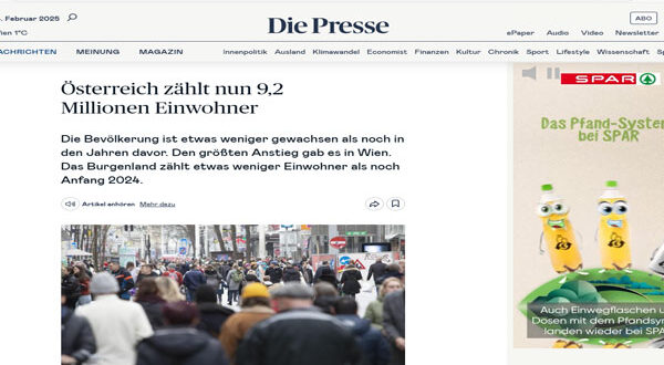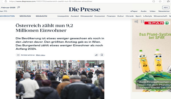 أعلنت هيئة الإحصاء المركزية في النمسا اليوم الخميس أن عدد سكان البلاد بلغ حوالي 2ر9 مليون نسمة مع بداية عام 2025 مسجلا زيادة قدرها 40 ألف شخص أي ما يعادل 4ر0 بالمئة مقارنة بالعام السابق.