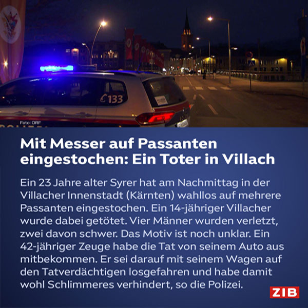 فيما أوضح الناطق باسم الشرطة راينر ديونيسيو أن “رجلا هاجم بشكل عشوائي مارة بسكين” في مدينة فيلاخ مؤكدا أن “فتى في الرابعة عشرة قتل”.