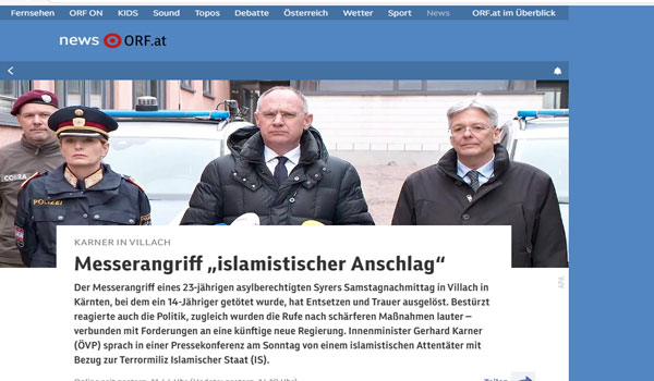 وقال الوزير أمام الصحفيين في مدينة فيلاخ حيث وقع الهجوم «إنه هجوم مرتبط بتنظيم داعش»، مشيراً إلى أن المشتبه به، وهو طالب لجوء سوري يبلغ 23 عاماً، اعتنق التطرف عبر الإنترنت «خلال فترة قصيرة».
