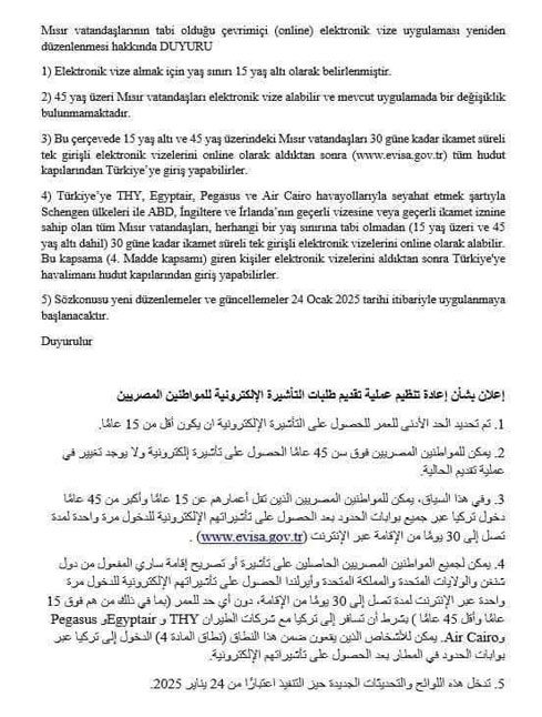 لكن، نتيجة للتجاوزات القانونية العديدة التي ارتكبتها بعض الشركات المصرية في تركيا خلال الأشهر الماضية، شددت الحكومة التركية إجراءات الحصول على التأشيرة الإلكترونية، وقصرتها على من تتراوح أعمارهم بين 15 و45 عامًا، بهدف الحد من تدفق الوافدين المصريين إلى تركيا.