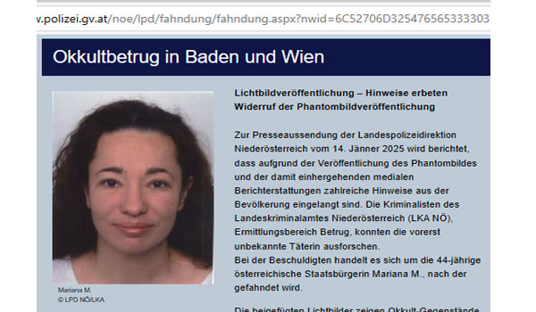 أعلن وزير الداخلية النمساوي جيهارد كارنر، أن الشرطة أصدرت أمرا بالقبض على سيدة تدعي امتلاكها قوى خارقة استطاعت من خلالها الاحتيال على عدد كبير من كبار السن والمرضى.