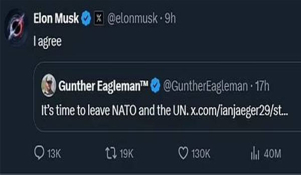 أثار إييلون ماسك مخاوف عميقة في الأوساط الأوروبية بعد أن أبدى دعمه العلني لفكرة انسحاب الولايات المتحدة من الأمم المتحدة وحلف شمال الأطلس (الناتو).