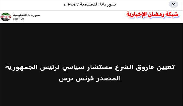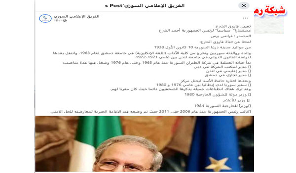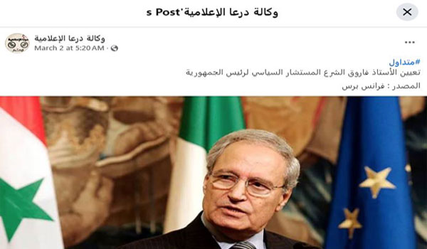 زاعمين أن الوكالة الفرنسية نشرت أن الرئيس السوري الجديد أحمد الشرع قام بتعيين نائب الرئيس السوري السابق ووزير الخارجية السوري الأسبق، فاروق الشرع، مستشاراً سياسياً له.