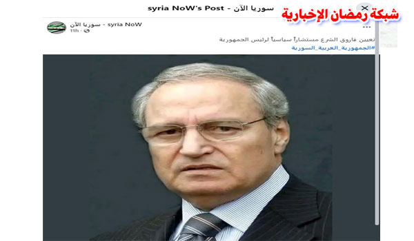 في حين نشر حساب على تويتر تحت اسم “عمر الدغيم” تغريدة قال فيها: “تعيين فاروق الشرع مستشاراً سياسياً لرئيس الجمهورية”.