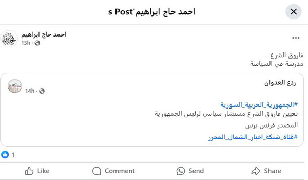 “عربي بوست” تحقق من دقة هذا “الخبر”، إذ رصد بعض الصفحات التي قامت بنشره ونسبته إلى وكالة فرانس برس الفرنسية، حيث كتبت صفحات منسوبة لسوريين على فيسبوك تفاصيل الادعاء الخاص بتعيين فاروق الشرع مستشاراً للرئيس السوري الجديد أحمد الشرع، كما هو موضح: