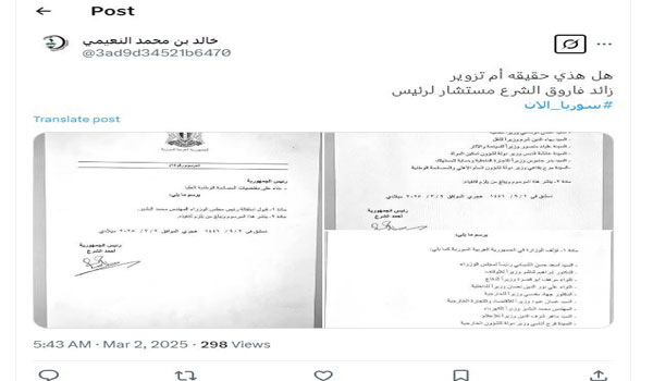 تتبع “عربي بوست” أصل الإشاعة، وقد وصل إلى حساب في تويتر لشخص يدعى خالد بن محمد النعيمي، قام بنشر قائمة من الشخصيات مذيّلة بتوقيع قال إنه لأحمد الشرع، تضمنت هذه القائمة إقالة الحكومة السورية الحالية برئاسة محمد البشير وتعيين حكومة جديدة.