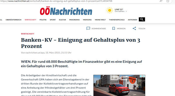 بعد مفاوضات مكثفة، توصلت نقابة GPA وأصحاب العمل في قطاع البنوك في النمسا إلى اتفاق يقضي برفع الحد الأدنى للأجور بنسبة 3%، وذلك اعتبارًا من 1 أبريل المقبل. ويشمل هذا التعديل حوالي 68,000 موظف في القطاع المالي، وفقًا لما أوردته وكالة الأنباء النمساوية (APA).