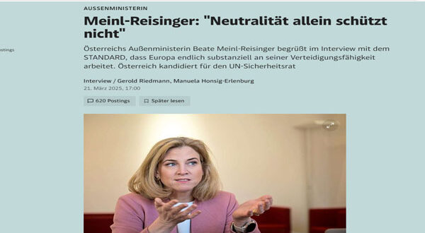 في مقابلة مع صحيفة DER STANDARD، أوضحت ماينل-رايسينغر أن النمسا محايدة عسكريًا ولكنها ليست محايدة سياسيًا، مؤكدة أن الالتزام بمستقبل أوروبي موحد لا يتعارض مع مبدأ الحياد. وانتقدت بشدة موقف حزب الحرية النمساوي (FPÖ) الذي يرى أن تحركاتها تهدد هذا الحياد، واصفة هذا الفهم بأنه “غير مسؤول دستوريًا”.
