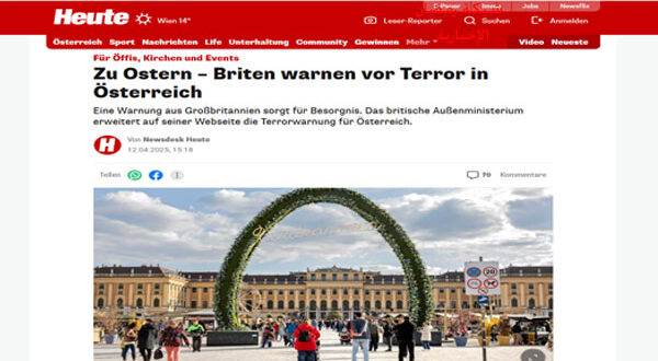 في وقت يُفترض أن تعم فيه أجواء الفرح والاحتفال، خيّمت سحابة من القلق على النمسا مع اقتراب عيد الفصح، بعدما أصدرت وزارة الخارجية البريطانية تحذيرًا أمنيًا صارمًا بشأن احتمال وقوع هجمات إرهابية تستهدف أماكن عامة ومواقع سياحية في البلاد.
