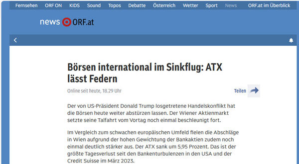 من فيينا إلى وول ستريت، انخفضت المؤشرات الرئيسية بشكل حاد، ليخسر مؤشر ATX النمساوي قرابة 7% في يوم واحد، في أسوأ تراجع له منذ سنوات. أما مؤشر S&P-500 الأمريكي، فقد خسر 2.4%، وناسداك خسر 2.8%. وبلغ إجمالي الخسائر العالمية أكثر من تريليون دولار أمريكي – ضريبة فوضى اقتصادية يصنعها السياسيون بينما يدفع ثمنها المواطن العادي.