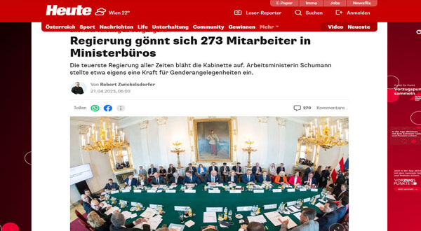 بينما يطالب المواطنون النمساويون بالتقشف وضبط النفقات العامة، وبينما تزداد أسعار المواد الغذائية والسكن والطاقة بشكل خنق طبقات واسعة من المجتمع، تظهر الحكومة الائتلافية الحالية بمشهد لا يشبه سوى قصور البذخ السلطوي في جمهوريات الموز: 273 موظفًا في مكاتب الوزراء وكُتاب الدولة، دون احتساب السائقين أو السكرتاريا أو “فريق القهوة”!