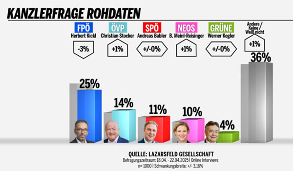 وعلى صعيد الشعبية الشخصية، لا يزال هربرت كيكل يتصدر السباق نحو المستشارية، إذ أعرب 25% من المستطلعين عن رغبتهم في اختياره مباشرة كمستشار للنمسا. ورغم أن هذه النسبة تمثل تراجعًا طفيفًا، إلا أنها تساوي تقريبًا مجموع التأييد لخصميه الرئيسيين: كريستيان شتوكر عن حزب الشعب، وأندرياس بابلر عن الحزب الاشتراكي.