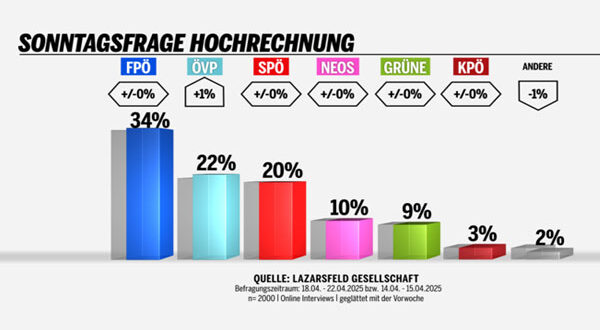 في مشهد سياسي يبدو مقلوبًا، يواصل حزب الحرية النمساوي (FPÖ) بقيادة هربرت كيكل صعوده اللافت في أحدث  استطلاع للرأي نشر اليوم الجمعة الموافق 25 من أبريل، رغم أنه يجلس على مقاعد المعارضة دون أي إنجازات ملموسة أو تحركات سياسية فعّالة. وفقًا لأحدث استطلاع أجرته مؤسسة “لازارسفيلد” لصالح صحيفة oe24، حافظ الحزب اليميني المتطرف على أعلى نسبة تأييد له حتى الآن، إذ حصل على 34% من نوايا التصويت – أي بزيادة قدرها خمس نقاط مئوية مقارنة بنتائج الانتخابات البرلمانية التي جرت في 29 سبتمبر 2024.